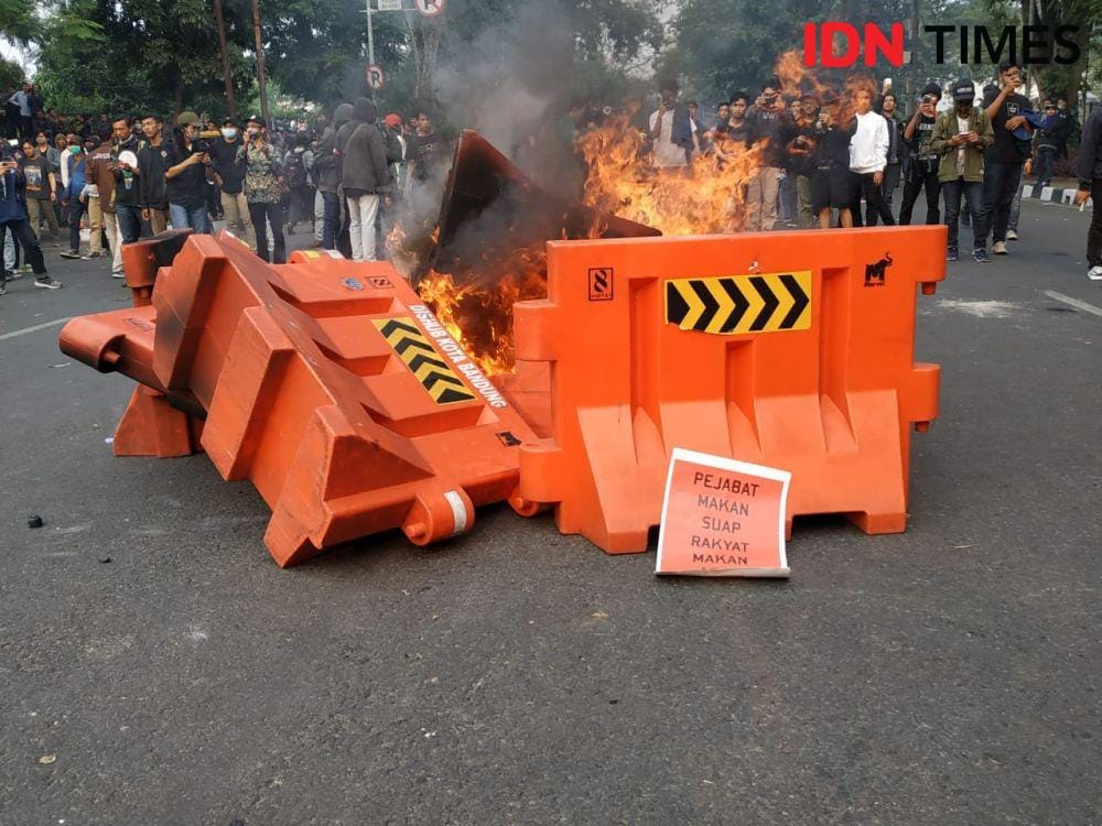 Kelompok massa yang tidak diketahui identitasnya bahkan melakukan aksi bakar barier yang berada di Jalan Diponegoro.